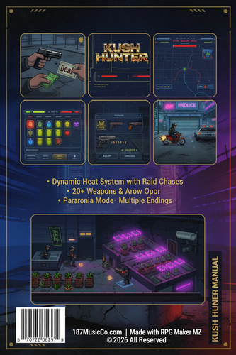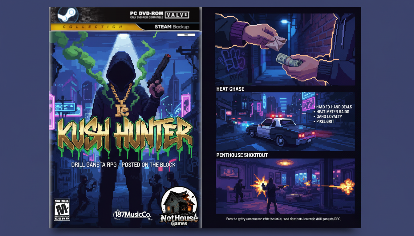 Kush Hunter is a gritty, satirical top-down RPG where you rise from broke street runner to legendary strain kingpin in a morally gray urban underworld. Risk heat from cops while collecting, growing, and flipping increasingly rare kush strains across seedy districts—each deal tests your REP, tests your DEX, and fills your pockets with dirty cash. Master the risk-reward loop: Acquire seeds from shady corner stores, cultivate high-potency strains in raided grow ops, then flip to high-end buyers while dodging escalating police patrols and rival enforcers. Every public sale spikes Heat, every smart play builds street REP—manage both to survive from The Block to penthouse suites. Turn-based street brawls feature improvised weapons, status effects like "High" and "Stunned," with branching NPC reactions from insults to VIP discounts.
